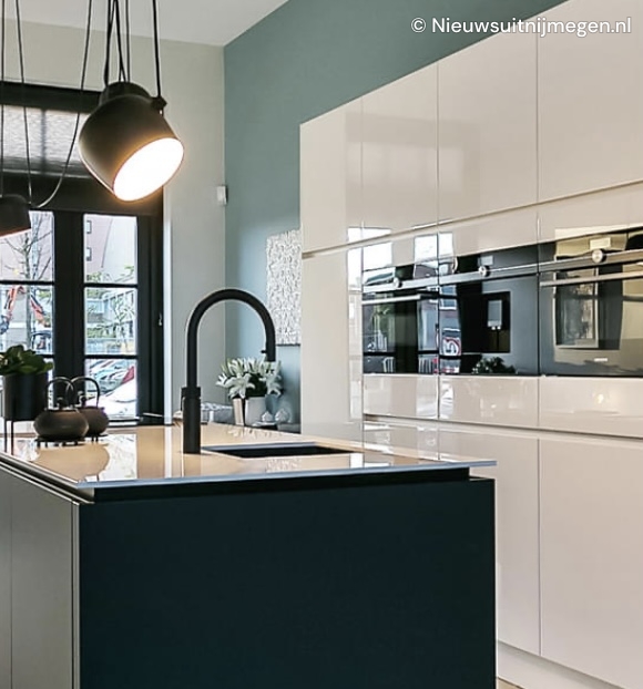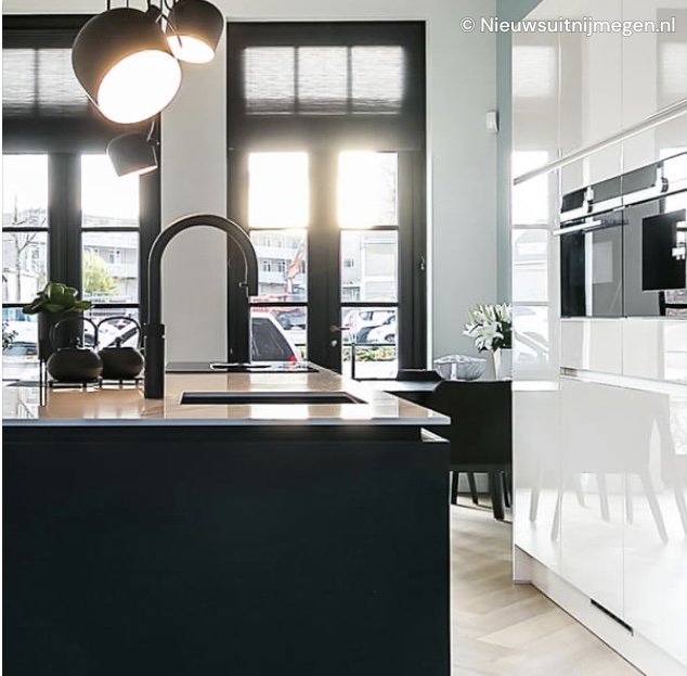 Een mooie keuken voor een modern-industriële woonstijl. Een matzwart kookeiland, met een hoogglans kastenwand als fris accent.