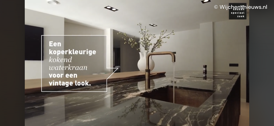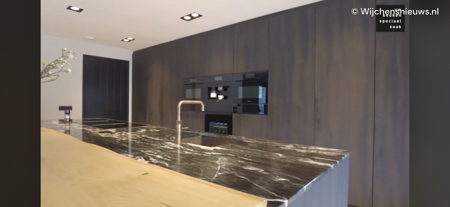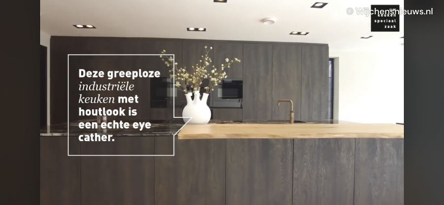 Maak van uw keuken een echte eyecatcher! Zoals deze industriële, greeploze keuken met houtlook en eigenzinnige details, zoals een koperkleurige kokend waterkraan. Compleet met Miele-inbouwapparatuur.