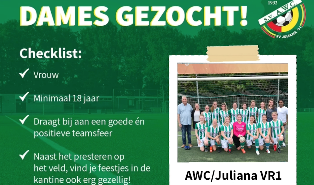 Ben jij ook in voor een partijtje competitief én toch gezellig vrouwenvoetbal? Dan is deze oproep wellicht iets voor jou: "Wij zijn AWC/Juliana VR1, een mix tussen speelsters van sv AWC in Wijchen & sv Juliana’31 in Malden. Samen vormen wij een heel gezellig team, maar vinden het ook belangrijk om een goede prestatie op het voetbalveld neer te zetten. Momenteel spelen wij 4de klasse, waar we afgelopen seizoen ook bovenaan zijn geëindigd. Daarnaast trainen we voorlopig één keer per week in zowel Wijchen als Malden.