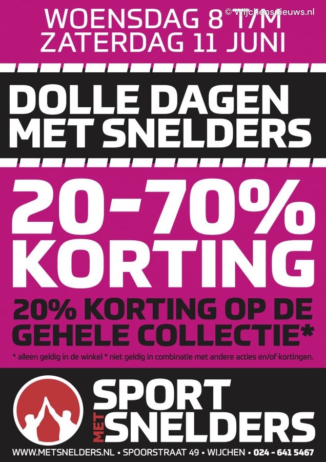 Van woensdag 8 t/m zaterdag 11 juni zijn er aan de Spoorstraat 49 in Wijchen de bekende Dolle Dagen van Sport met Snelders met 20 tot wel 70% korting! www.metsnelders.nl