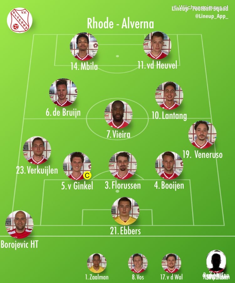 In de eerste echte aanval was het meteen raak, kon van Heesch eerst nog redden ten koste van een hoekschop, uit die hoekschop kon Floris Florussen verlengen en Owen Mbila afmaken: 0-1. Daarna kregen beide ploegen kansen, Alverna door wat beter veldspel en Rhode door veel inzet, maar zoals gezegd, de doelmannen waren moeilijk te passeren. Paul van Heesch redde op schoten van Lucas van den Heuvel en Sjoerd Booijen, en Max Ebbers plukte de bal van de voeten van Bas van Kuringen. Maar net op het moment dat je denkt dat het de ruststand wordt, haalt Bas van Kuringen uit, de bal wordt door Floris Florussen geraakt en Max Ebbers is kansloos: 1-1.