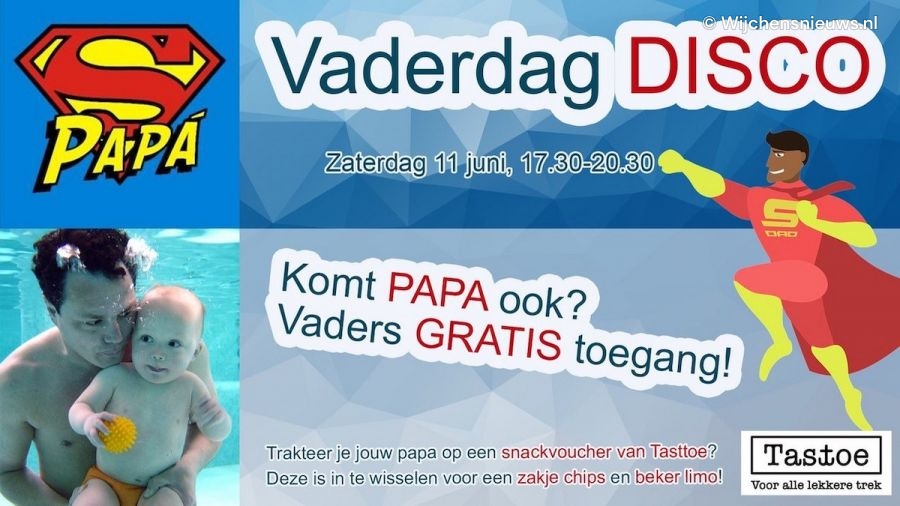 Op zaterdag 11 juni van 17.30 tot 20.30 uur is het alweer de laatste disco van dit seizoen. Kom jij samen met je papa zwemmen aan de Meerdreef 6? Vaders gratis toegang!