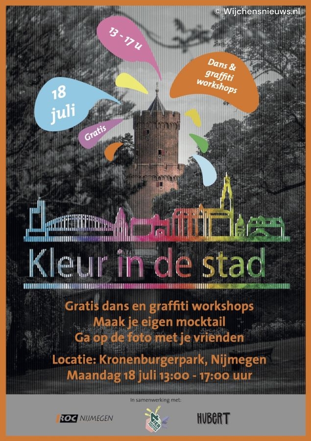 Tijdens de Vierdaagsefeesten organiseren studenten van ROC Nijmegen op maandag 18 juli een evenement speciaal voor jongeren van 13 -17 jaar in het Kronenburgerpark. Tijdens het evenement, genaamd Kleur In De Stad, komen bekende Dj’s draaien, kun je graffiti- en dansworkshops volgen en je eigen mocktail laten maken.