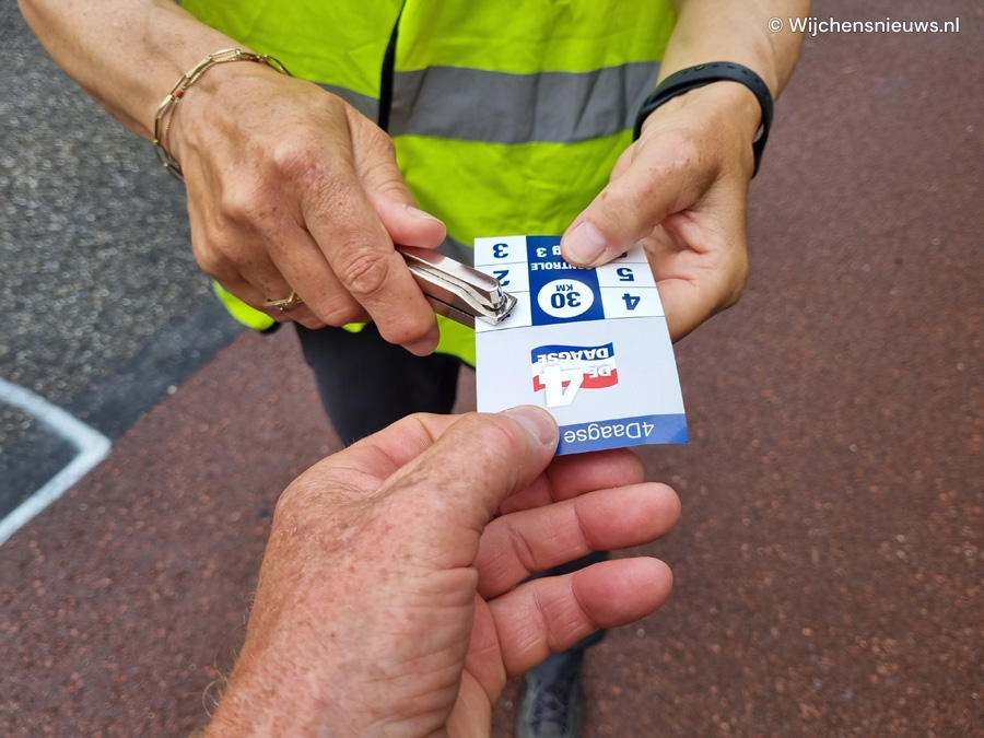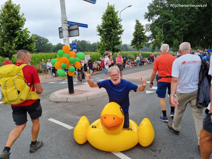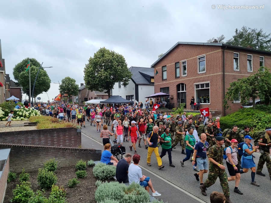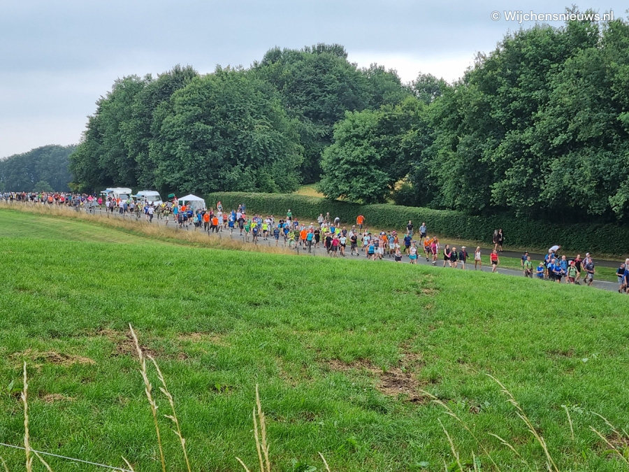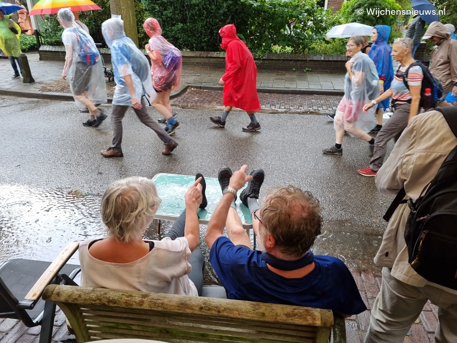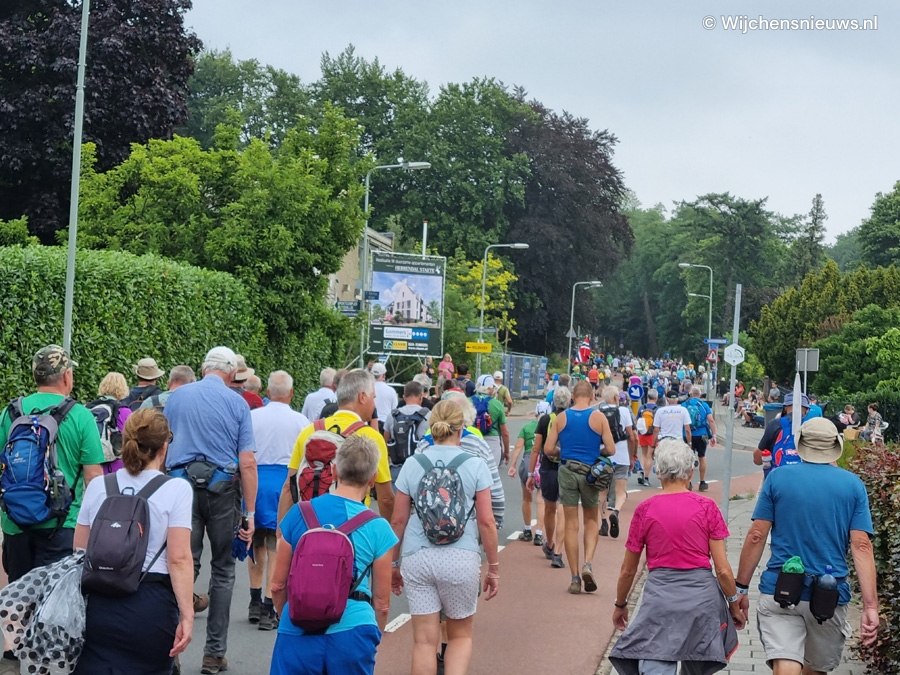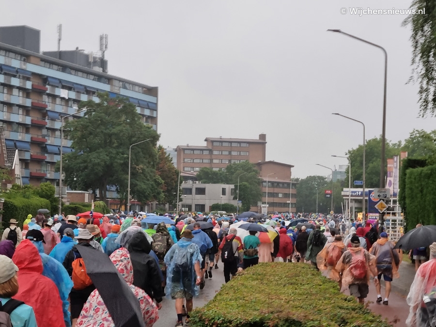 `Het was iets minder druk langs de weg dan anders, voor veel toeschouwers regende het toch te hard. De wandelaars waren dan ook vooral met zichzelf bezig en spaken elkaar moed in. Ik heb onderweg weer heel wat verhalen gehoord. Vooral leuke, over de geweldige sfeer en de gezelligheid, maar ook over minder leuke dingen die lopers mee hebben gemaakt. Zo vertelde een mevrouw dat een meneer door een medeloper ruw aan de kant werd gedrukt. Die meneer viel en hij haalde zijn knie open. Daar struikelde weer een andere loper over die met zijn hoofd tegen een stoeprand knalde. Die moest door een ambulance worden afgevoerd. Het blijft dus uitkijken.`