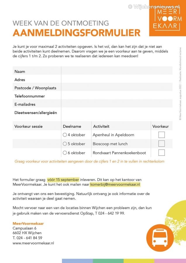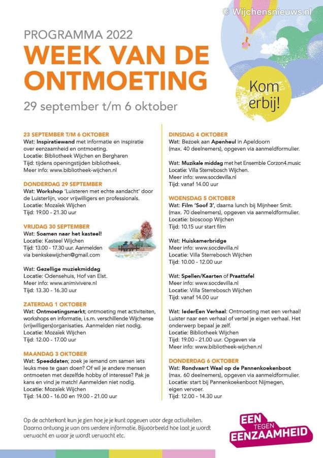 Initiatiefnemer MeerVoormekaar Wijchen en Druten laat weten: “Deze week staat bol van gezellige activiteiten. Vorig jaar was het een groot succes en we hopen het dit jaar dunnetjes over te doen. Lees de flyer en vul maar in. En wacht niet niet te lang want op is op!