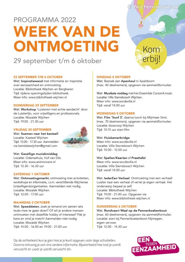 Kijk op de afbeelding wat er allemaal te doen is in Wijchen tijdens de Week tegen Eenzaamheid. Een week waarin ontmoeten en verbinding centraal staat: