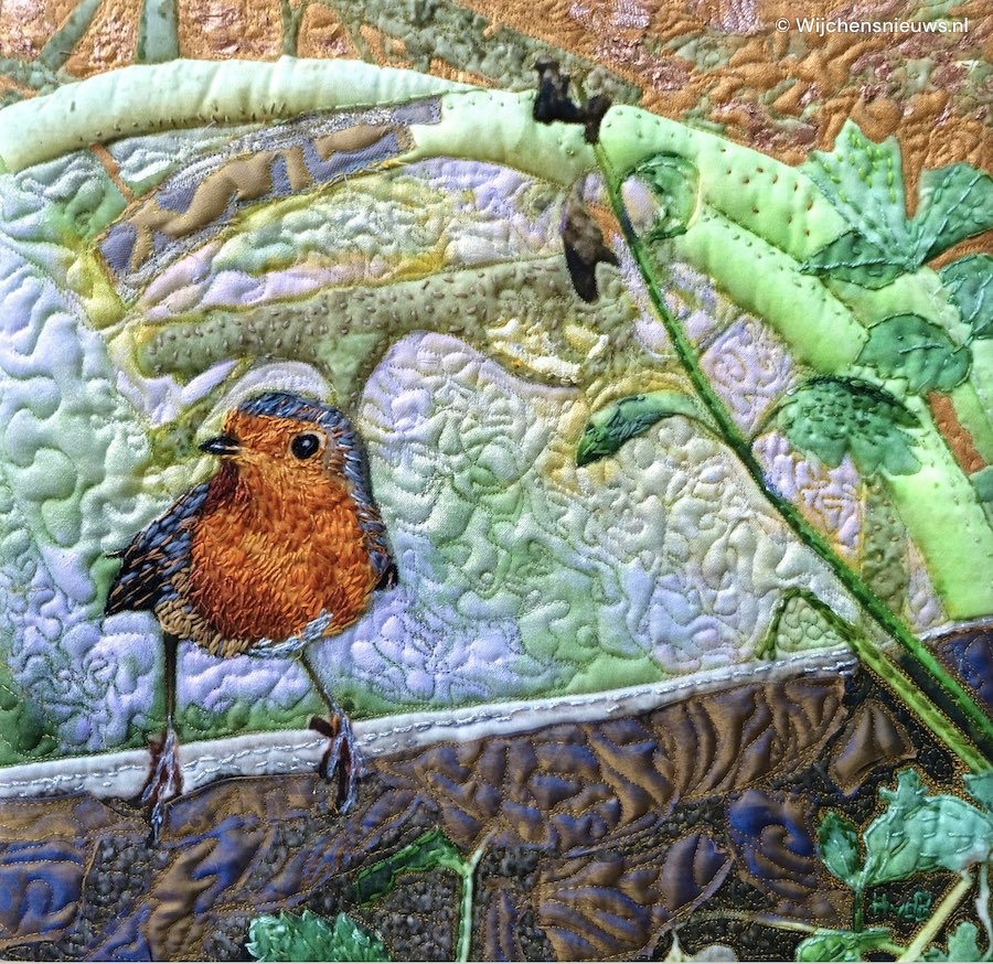 stikwerk op de naaimachine, het werken met reliëf en met hand borduren, ontstaan verrassende en onverwachte, symbolische kunstwerken in textiel.