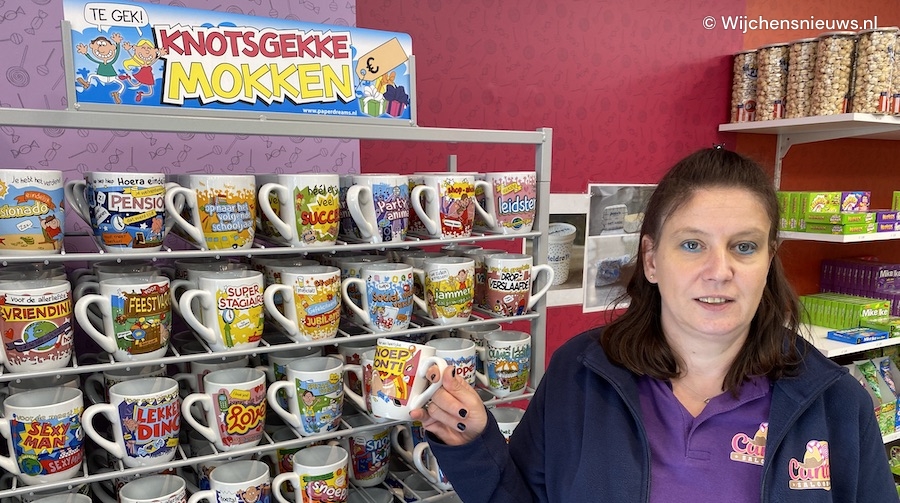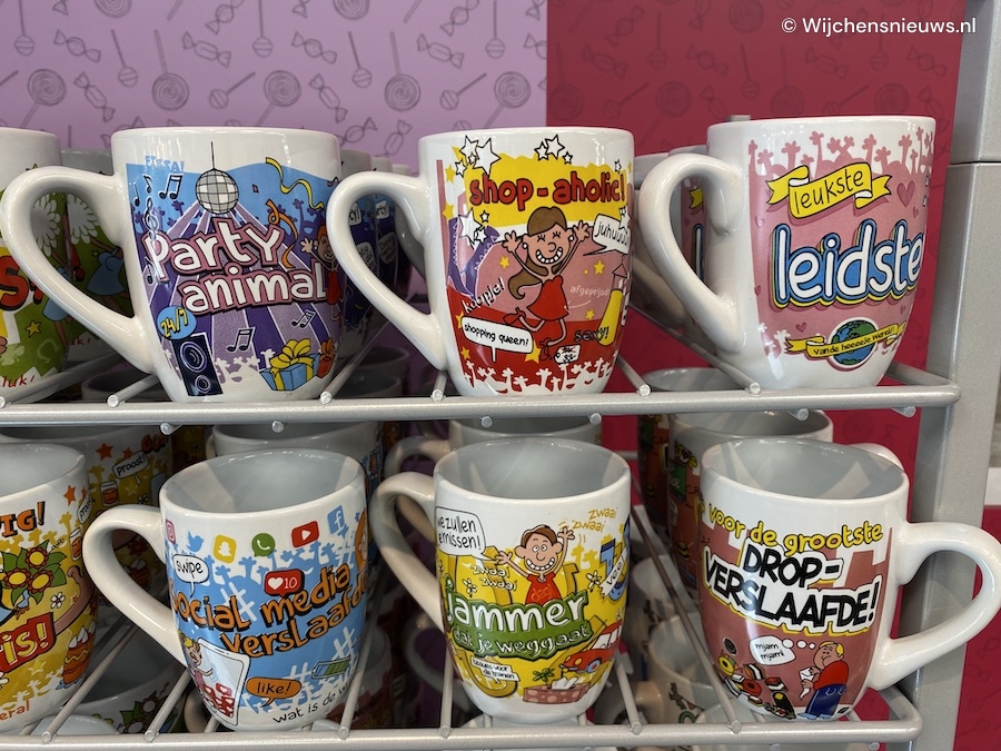De leuke mokken met opdruk als Sara, Sweet 16, Sexy Vrouw en Man, Gefeliciteerd Jubilaris, of Happy Birthday zijn ruim op voorraad op de Markt 8A bij de Candy Saloon.