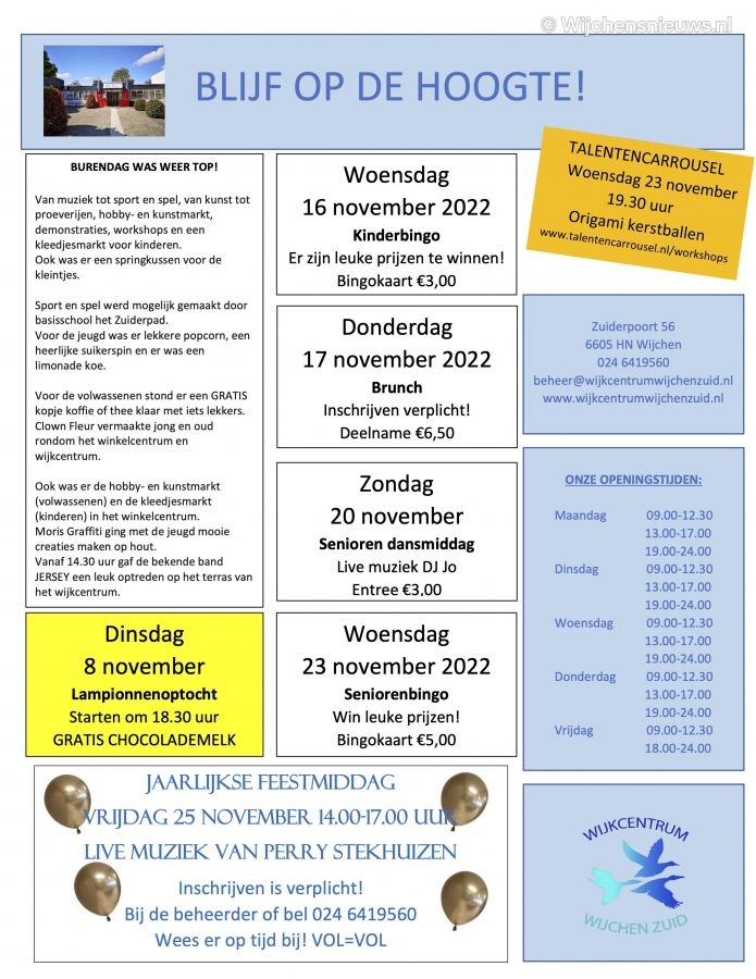 Ook in de maand november is er veel te beleven in Wijkcentrum Wijchen Zuid in de Zuiderpoort 56. Kijk maar op de poster! Meer info: 024 6419560 www.wijkcentrumwijchenzuid.nl beheer@wijkcentrumwijchenzuid.nl