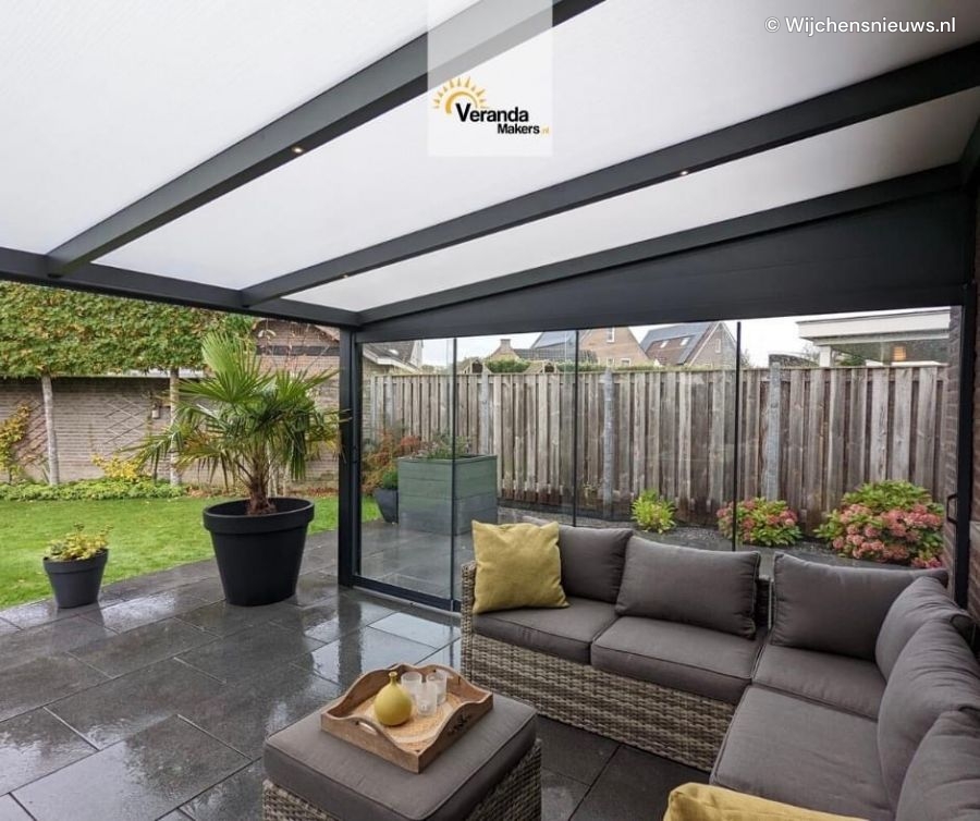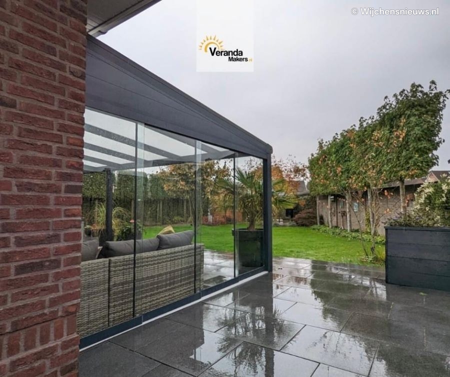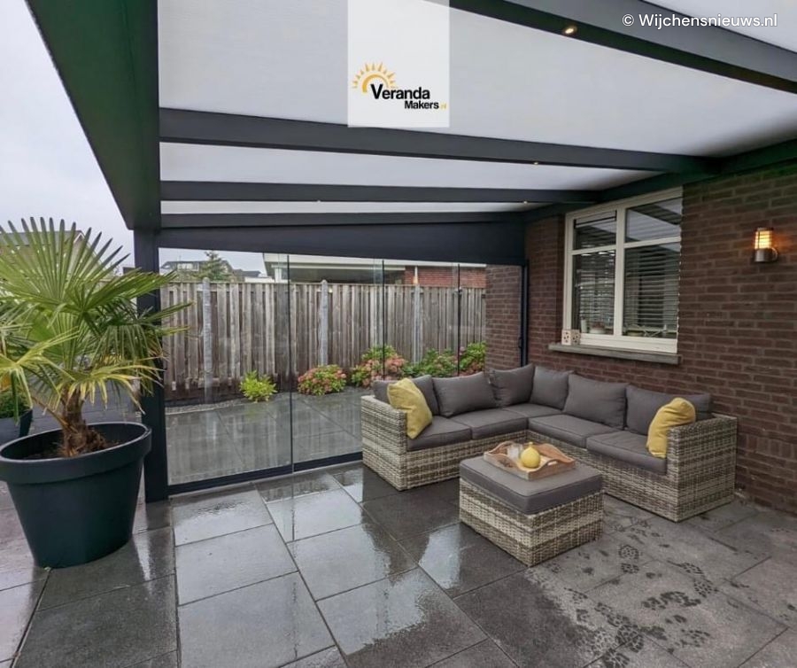“Bij een klant in Haps hebben wij twee jaar geleden een veranda geplaatst. Deze is nu uitgebreid met een glazen schuifwand aan de zijkant”, vertelt eigenaar Wesley Welgraven enthousiast. “Hierdoor kan de klant heerlijk genieten van de overkapping zonder last te hebben van wind of regeninslag. Ook kunnen de kussens op de loungeset het hele jaar door blijven liggen. Dat scheelt een hele hoop gesjouw!"