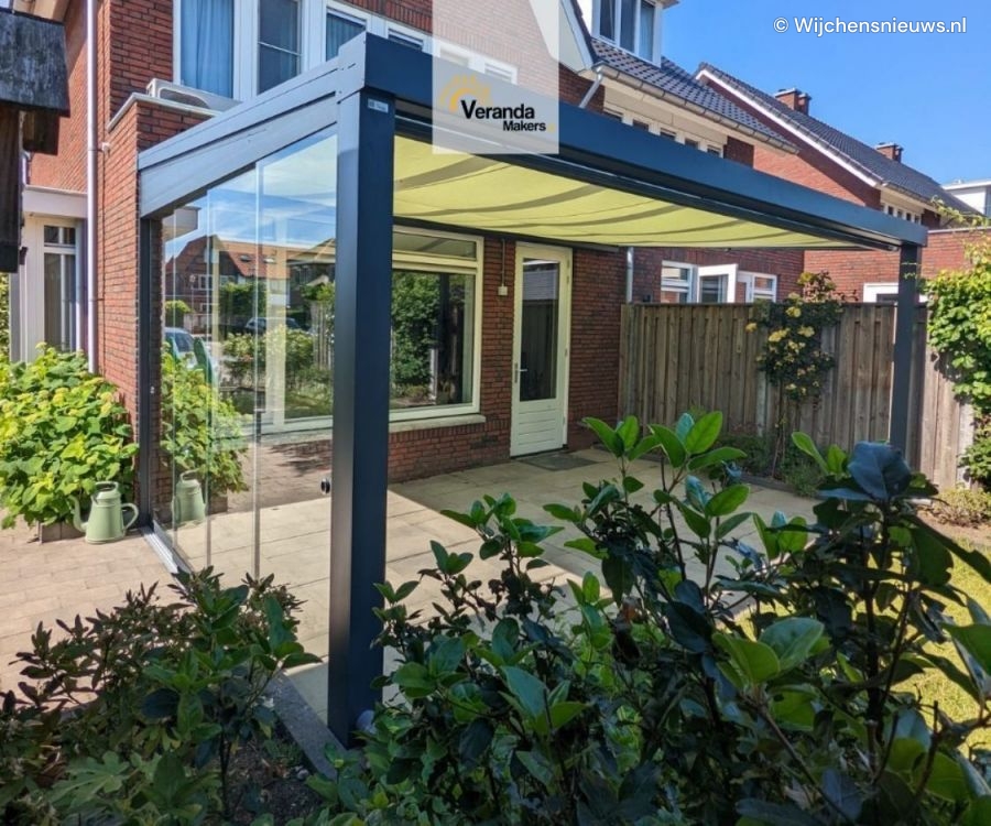 “Bij een klant in Nijmegen hebben we een veranda met elektrische onderdakzonwering mogen plaatsen. Aan de zijkant van de veranda hebben ze gekozen voor een glazen schuifwand”, laat het bedrijf Verandamakers enthousiast weten. “Zo kunnen ze de zijkant afsluiten wanneer er een frisse wind door de veranda blaast, maar deze ook open zetten wanneer er juist verkoeling nodig is!”