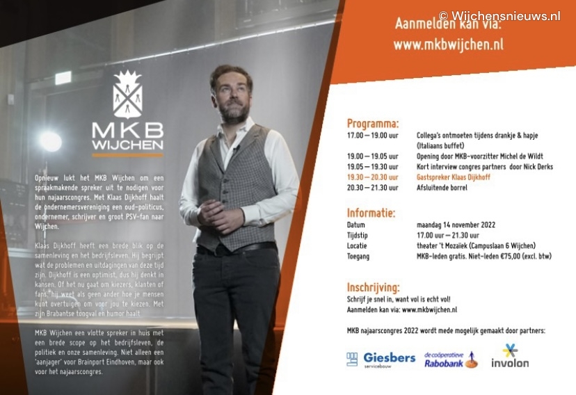 De nieuwe MKB Wijchen-voorzitter Michel de Wildt laat beslist weten: “Het najaarscongres van MKB Wijchen op maandag 14 november in Theater ‘t Mozaïek is er om elkaar te ontmoeten, elkaar te spreken, met elkaar te sparren maar bovenal om te genieten van spreker Klaas Dijkhoff met zijn brede blik op de samenleving en het bedrijfsleven. Wil je erbij zijn, schrijf je in via www.mkbwijchen.nl!”