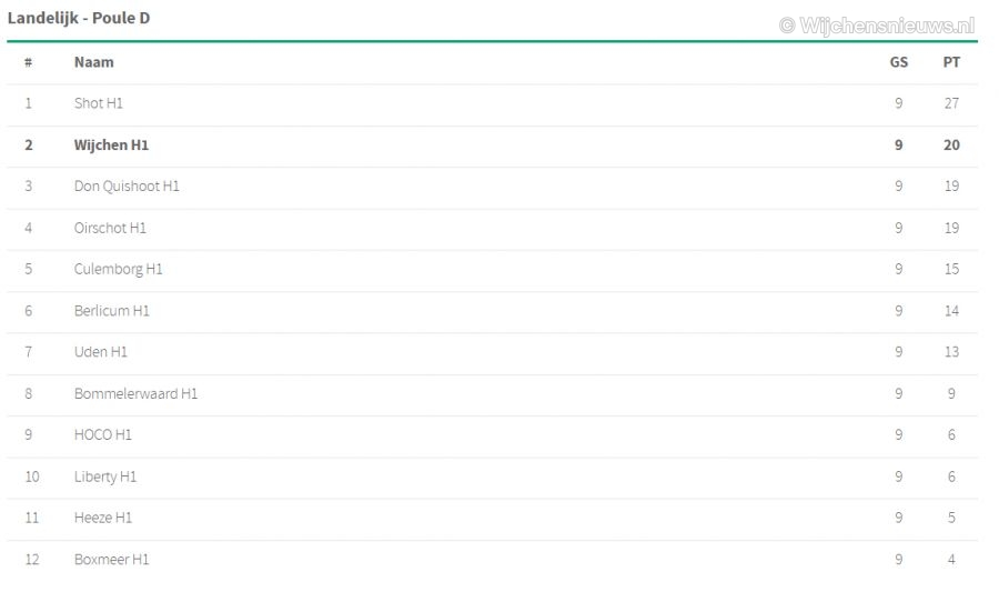 De Wijchenaren mogen kritisch zijn na de wedstrijd van afgelopen zondag. Hun harde werk resulterend in een gelijkspel tegen Don Quishoot een week eerder, hadden zij bijna tenietgedaan door punten te verspelen in Dongen. De winst van zondag leidt er echter toe dat Wijchen Heren 1 nu de tweede plek in de competitiestand bezet (zie de stand hieronder). Aanstaande zondag speelt Heren 1 vanaf 14:45 tegen HOCO in de laatste thuiswedstrijd van de eerste seizoenshelft.