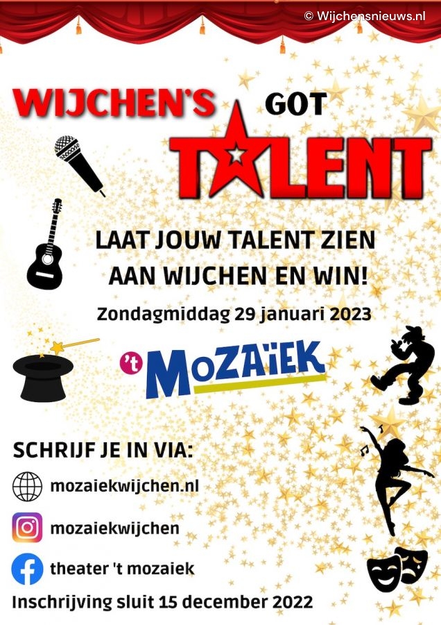 Op zondagmiddag 29 januari 2023 sluit Theater ’t Mozaïek het Nationaal Theaterweekend af met een wervelende talentenjacht. Niemand minder dan Holland’s Got Talentcoryfee Lisette Brillemans neemt plaats in de jury van dit event, waarmee ze als zesvoudig deelnemer eindelijk eens de andere kant van zo’n wedstrijd meemaakt. Talenten kunnen zich via mozaiekwijchen.nl, instagram en facebook inschrijven voor Wijchen’s got talent, waarbij ieder genre en ieder podiumtalent van harte welkom is.