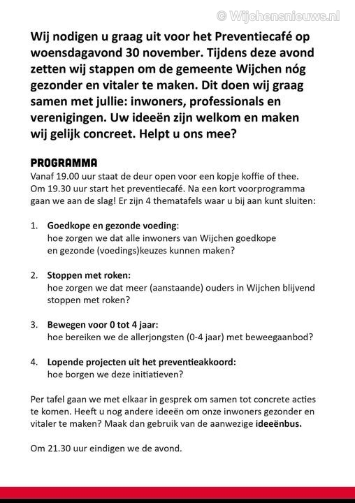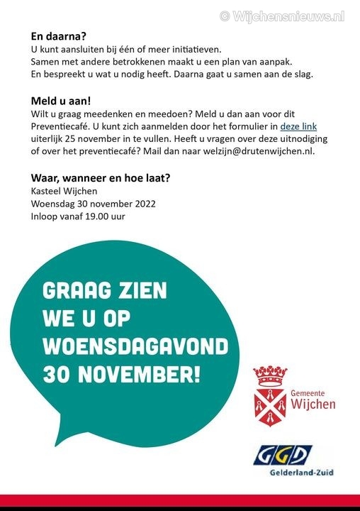 Op woensdagavond 30 november is het Preventiecafé in Kasteel Wijchen. Tijdens deze avond zet de gemeente stappen om Wijchen nóg gezonder en vitaler te maken.: "Dit doen wij graag samen met u: inwoners, professionals en verenigingen. Uw ideeën zijn welkom en maken wij gelijk concreet. Helpt u ons mee?