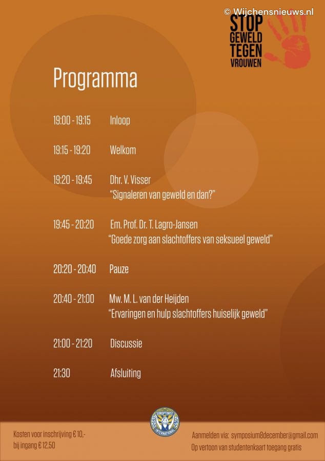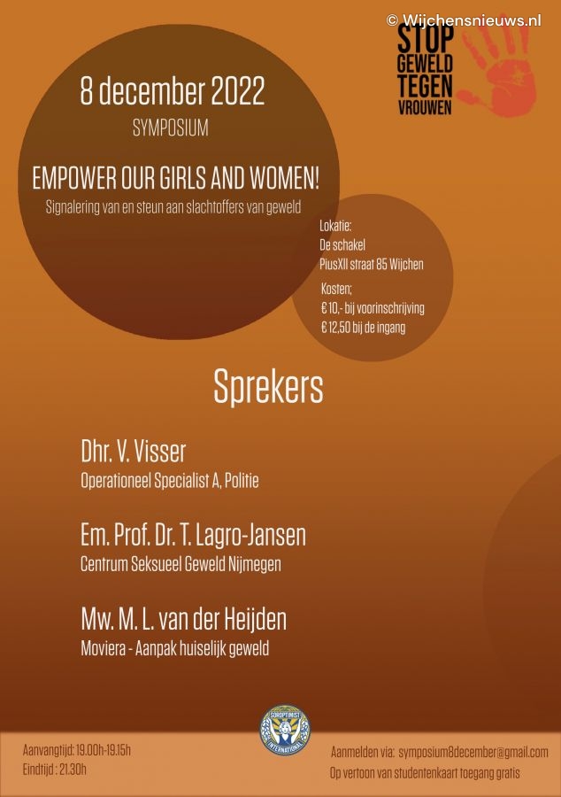Op het symposium zal gesproken worden over hoe we geweld tegen meisjes en vrouwen kunnen opmerken, wanneer en waar we het kunnen melden, wat er vervolgens met een melding gebeurt ook wanneer het seksueel geweld betreft en hoe we slachtoffers tot steun kunnen zijn en kunnen begeleiden naar een leven zonder geweld.