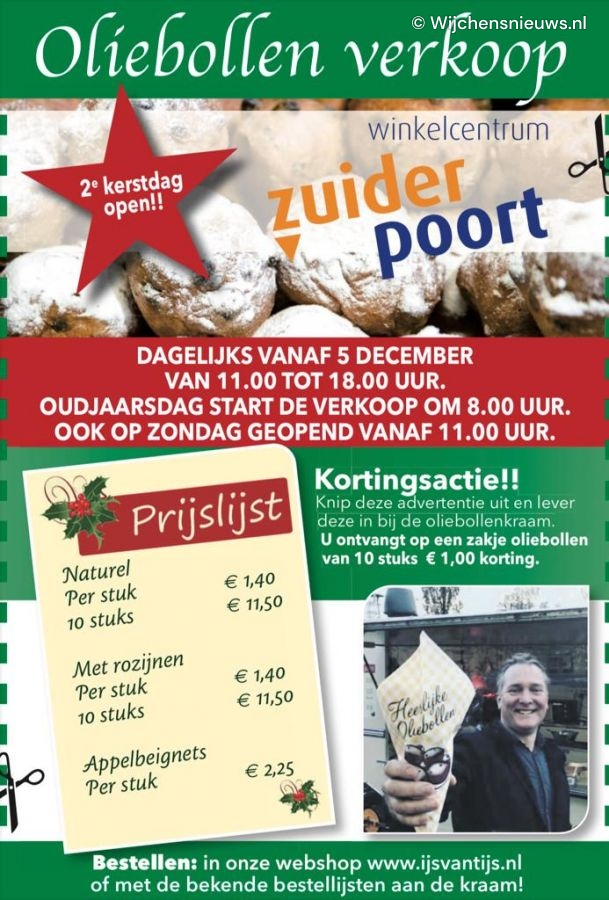 Pierre: “En ook onze appelbeignets, dit jaar voor €2,25 per stuk, zijn een begrip in Wijchen geworden. En wat onze oliebollen betreft (met of zonder rozijnen), je krijgt er 10 voor €11,50 - mét poedersuiker natuurlijk!”