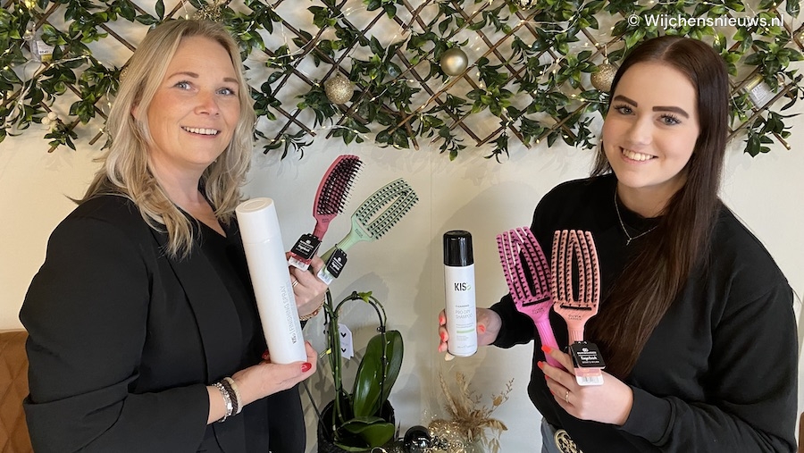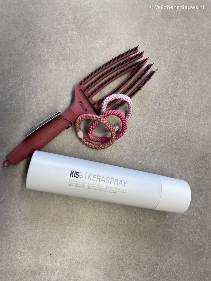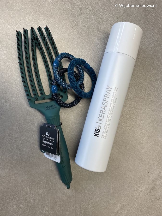 Zo is er de Kis Keraspray 300 ml voor vrouwen met een Banditz elastiekje/armband en ook een Olivia Garden-borstel voor €29,95.
