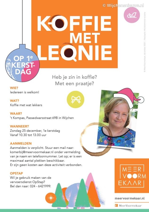Heb je geen plannen voor 1e Kerstdag en lijkt het je gezellig om koffie te drinken met andere mensen? Op zondag 25 december kun je langskomen voor Koffie met Leonie, in het Kompas aan de Passedwarsstraat 69B in Wijchen van 10.30 tot 13.00 uur. Lees de flyer even door hoe je je kunt aanmelden via komerbij@meervoormekaar.nl.
