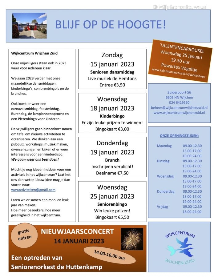 Alvast noteren! Ook in de maand januari is er veel te beleven in Wijkcentrum Wijchen Zuid in de Zuiderpoort 56. Kijk maar op de poster! Meer info: 024 6419560 www.wijkcentrumwijchenzuid.nl beheer@wijkcentrumwijchenzuid.nl