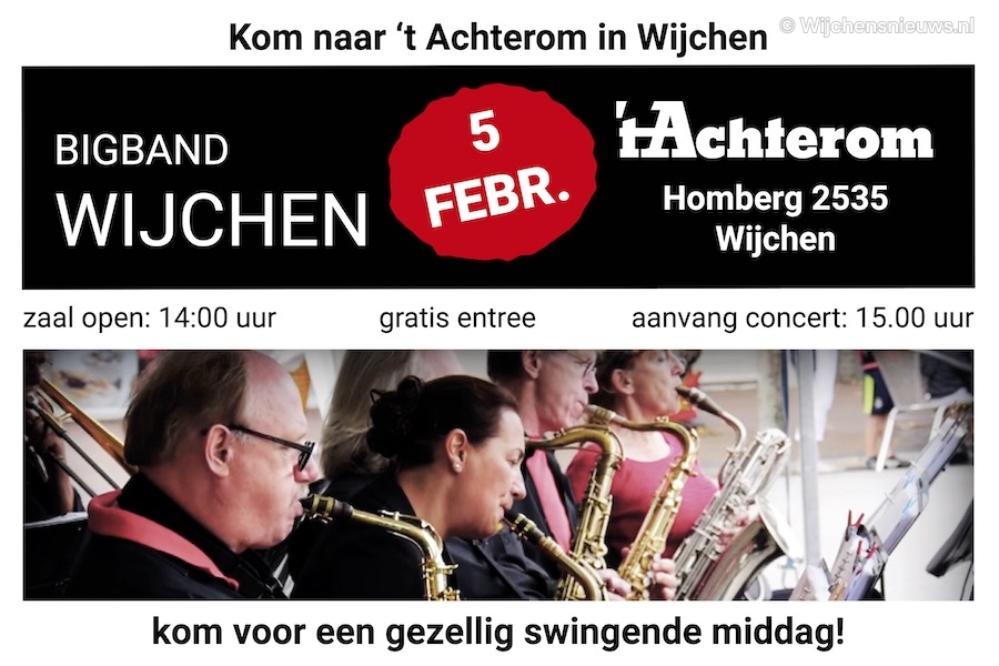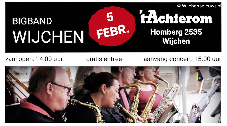 Alvast noteren! Op zondag 5 Februari treedt Bigband Wijchenop in ’t Achterom aan de Homberg 2535 in Wijchen.