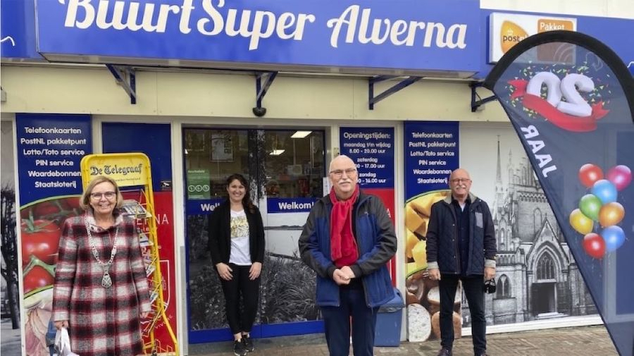 Archieffoto 2020: burgemeester Van Beek en Dorpsraad Alverna feliciteren de Buurtsuper met het 20-jarig bestaan.