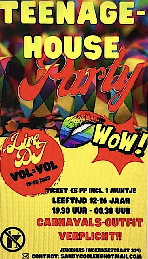 Hoe toepasselijk is dan ook de naam Teenage House Party! Dus vrijdag 17 februari 2023 vanaf 19.30u is het TEENAGE-HOUSE PARTY met LIVE DJ!