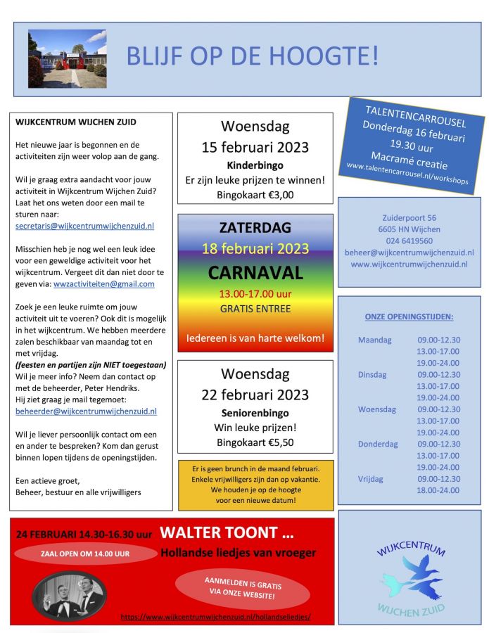Alvast noteren! Ook in de maand febuari is er veel te beleven in Wijkcentrum Wijchen Zuid in de Zuiderpoort 56. Kijk maar op de poster! Meer info: 024 6419560 www.wijkcentrumwijchenzuid.nl beheer@wijkcentrumwijchenzuid.nl