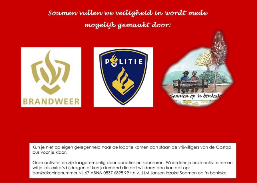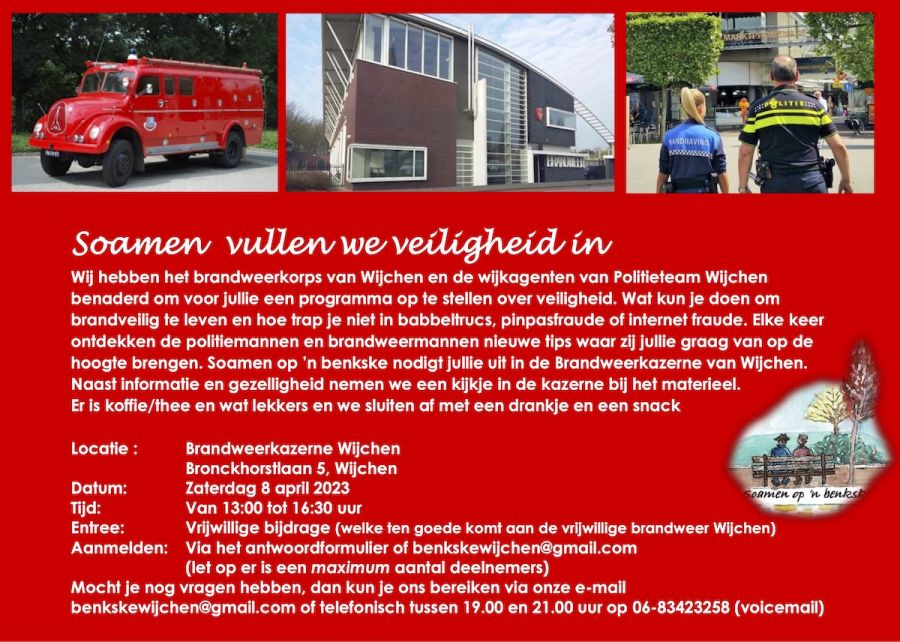 Soamen op ’n benkske heeft het brandweerkorps van Wijchen en de wijkagenten van Politieteam Wijchen benaderd om voor de deelnemers van Soamen op ’n benkske een informatief programma op te stellen over veiligheid. De deelnemers van Soamen op ’n benkske zijn vooral oudere alleenwonende Wijchenaren. Deze informatieve middag (8 april) in de brandweerkazerne van Wijchen geeft hen meer handvaten om veiliger te wonen en te leven. Natuurlijk is er naast informatie de mogelijkheid om een kijkje in de kazerne te nemen bij het materieel en is er tijd voor gezelligheid. Er is koffie/thee en wat lekkers en we sluiten af met een drankje en een snack