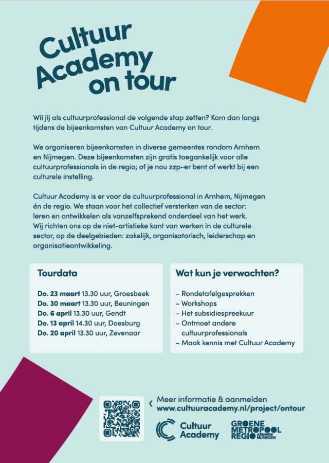 Vanaf maart 2023 toert Cultuur Academy door de GMR-gemeenten Berg en Dal, Beuningen, Doesburg, Druten, Duiven, Heumen, Lingewaard, Overbetuwe, Renkum, Rheden Rozendaal, Westervoort, Wijchen en Zevenaar. Tijdens een reeks van 5 bijeenkomsten in Groesbeek, Beuningen, Gendt, Doesburg en Zevenaar wordt het gesprek gevoerd met culturele professionals: van zzp-er tot bestuurder.