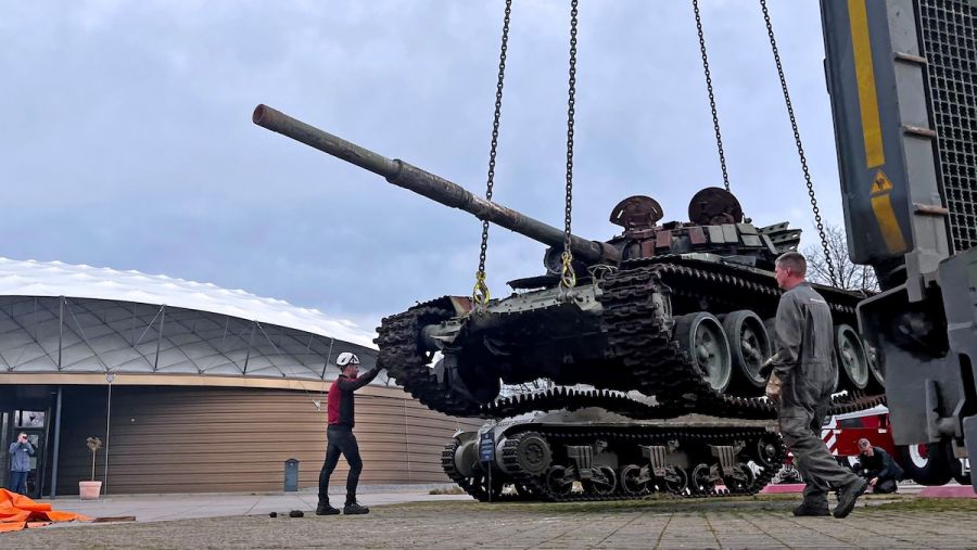 Voor het gebouw van het Vrijheidsmuseum in Groesbeek staan een vernielde Russische tank en een met kogels doorzeefde Oekraïense ambulance. De 44 ton zware T-72B-tank werd in maart 2022 buitgemaakt door het Oekraïense leger nadat deze tijdens een Russische aanval op Kyiv op een Franse mijn was gelopen en zwaar beschadigd raakte.