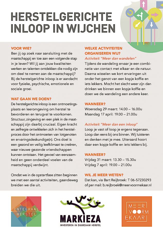 Ben jij op zoek naar aansluiting met de maatschappij, toe een volgende stap in je leven? Bekijk bovenstaande flyer dan eens Je vindt Integraal Herstel in het Mozaïek aan de Campuslaan 6 in Wijchen (op de begane grond). Daar vinden diverse activiteiten plaats:
