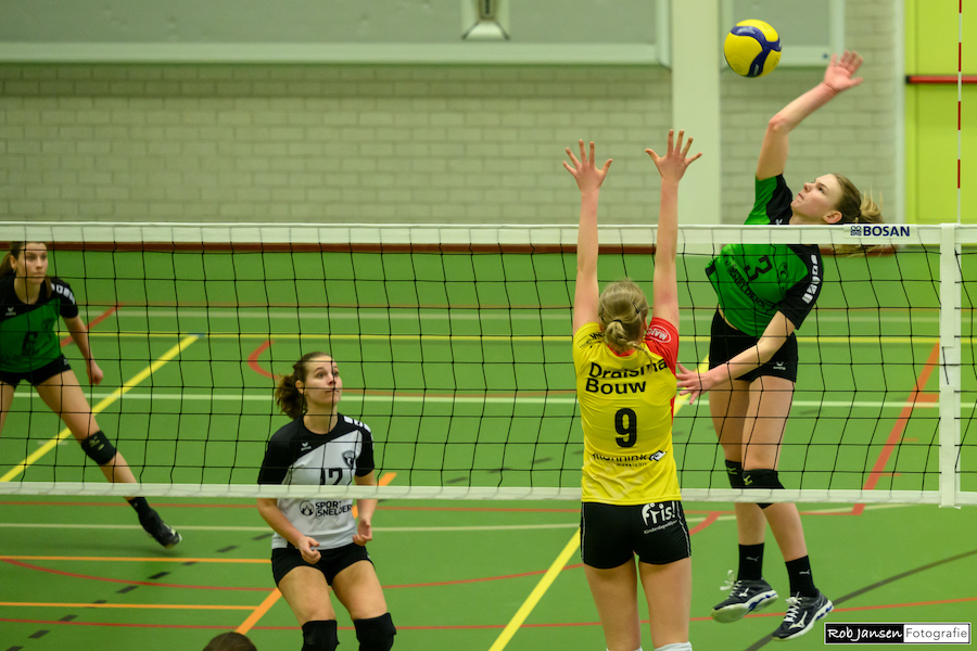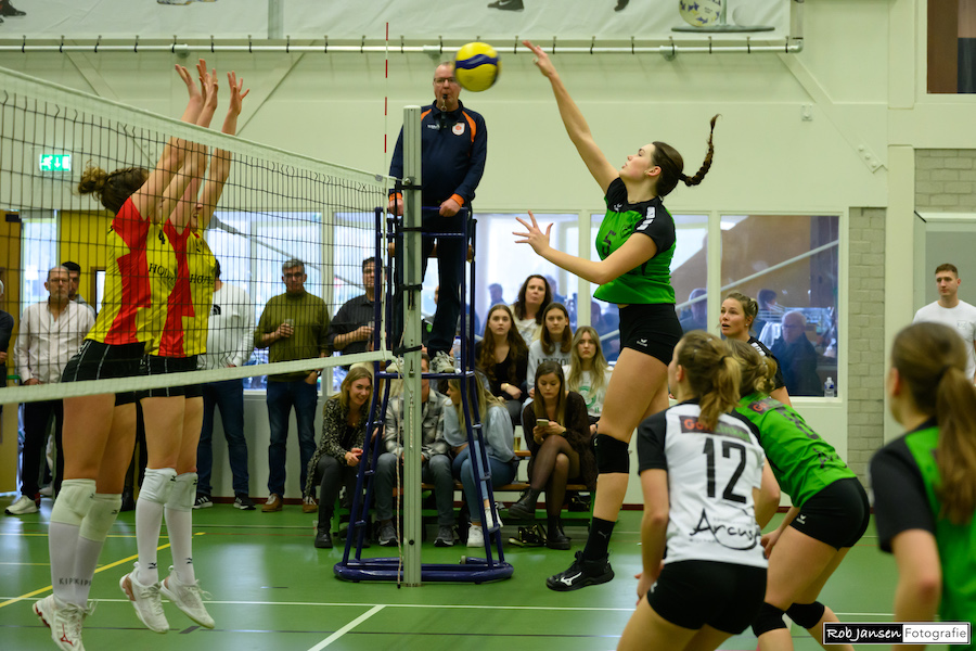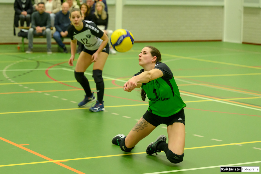 Het was erop of eronder afgelopen zaterdag voor Trivos. Winst van de wedstrijd betekende voor beide teams de derde plek en daarmee een steviger uitgangspositie voor het eventueel spelen van een promotiewedstrijd over enkele weken. De druk is dus best hoog. Aan het begin van de eerste set is dat te merken aan de vele servicefouten die beide teams maakten. Vanaf de start is het tempo hoog en laten beide teams gevarieerd spel zien. De verdediging aan beide kanten is goed, waardoor rally’s lang zijn. Trivos komt na mooi aanvalswerk van Roos Mast, Kristy Goijarts en Evie Driessen voor het eerst op voorsprong. Als Norah van Beers even later twee snelle midaanvallen heeft is het verschil vier punten. Trivos houdt deze voorsprong vast en laat aan het net een sterk blok zien op het midden met onder andere Debbie de Graaf. Dynamo blijft echter knokken en komt bij tot 22-21. Peter Groenen grijpt in met een time-out. Dit pakt goed uit, want de volgende drie punten pakt Trivos. Zo winnen ze de set met 25-21.