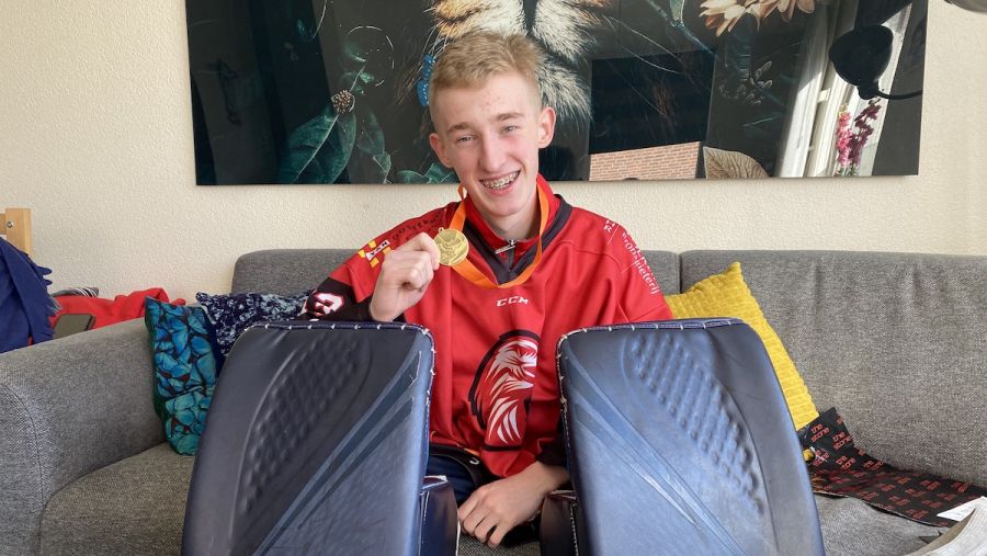 Hoe jong was je toen je begon te ijshockeyen? Luc: “Heb tot mijn 13e bij AWC gevoetbald en ben toen naar de Nijmegen Devils gegaan waar ik een jaar gespeeld heb. Ik kon als keeper bij Den Bosch meer leren en maakte in 2021 de overstap. Nu train ik 2 dagen 5 uur per week en dat vind ik super!”
