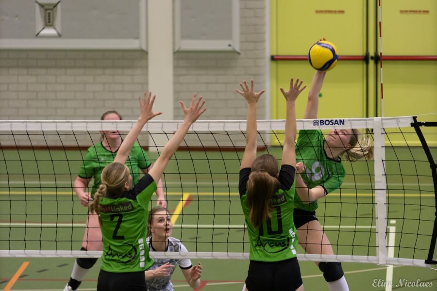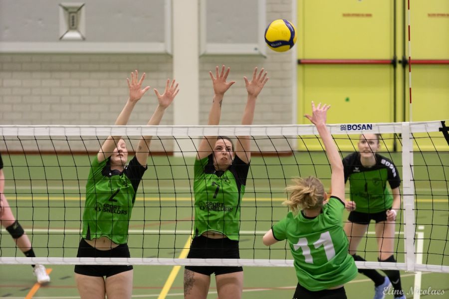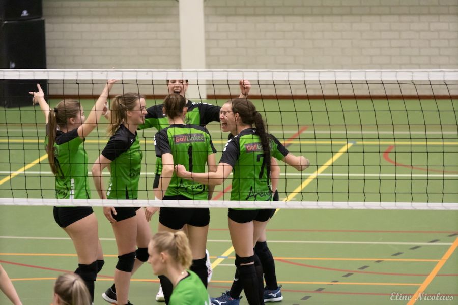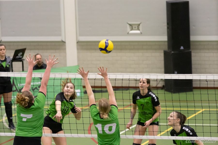 Volle tribunes vol groen geklede supporters van zowel Trivos als SSS zagen zaterdag het team van SSS onderuit gaan. Trivos wordt vandaag gecoacht door Hennie Visser en Femke Rongen, omdat Peter Groenen met de meisjes B mee is naar het Nederlands Open Jeugd Kampioenschap (NOJK). Daardoor staat Trivos qua teamsamenstelling bij aanvang op papier op achterstand want ook speelsters Norah van Beers en Ellin Siroo zijn mee naar de finaleronde van het NOJK. Bovendien is Evie Driessen geblesseerd. Om dit gat op te vullen is Marit Pansier uit dames 4 aangehaakt. In de eerste set blijkt al hoe hoog de spanning aan beide kanten is. SSS tikt twee ballen uit en de stand gaat gelijk op. Beide teams spelen nog niet voluit, maar gaan wel voor elke bal. De rally’s zijn lang en spannend. Mooi aanvalswerk bij Trivos is er van Kristy Goijarts, Debbie de Graaf en Esmee Driessen. Bij de stand 13-12 komt Trivos voor het eerst op voorsprong. Trivos levert ook verdedigend sterk werk met Roos Mast en libero Wieneke Eggermont die zelfs met haar voet een bal weet te redden. Aan het eind van de set gaat SSS echter uitlopen. Een time-out van Trivos bij de stand 18-23 mag niet meer baten. Een ace van SSS beslist de set op 18-25.