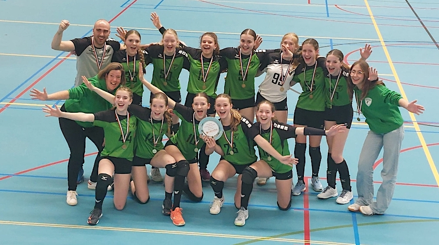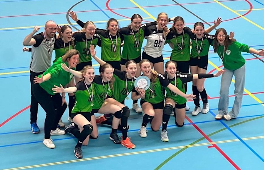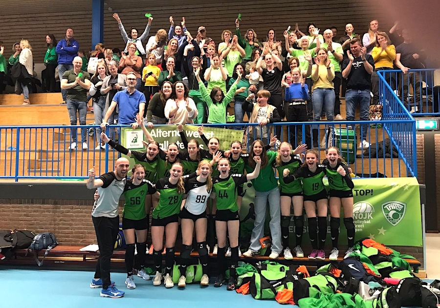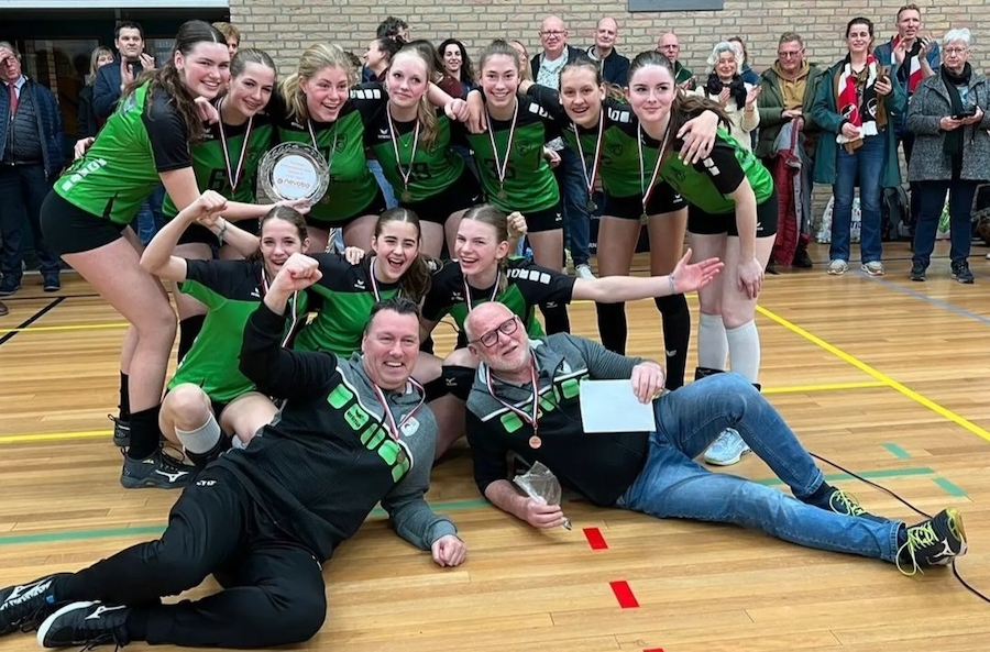 (Foto boven) De meiden B hebben ook een topprestatie geleverd en werden derde van Nederland! De meiden begonnen tegen Sliedrecht Sport en dit werd een gelijkspel in het voordeel van Trivos (21-25 en 25-10). Daarna speelden de meiden tegen VC Sneek, ook dit werd een gelijkspel, maar dan in het voordeel van VC Sneek (17-25 en 21-25). De laatste poulewedstrijd tegen Rivo Rijssen wisten de meiden te winnen (25-20 en 25-6). De kruisfinale werd tegen het sterke Apollo 8 gespeeld en werd helaas nipt verloren (25-22 en 25-21). De meiden moesten hierdoor spelen om het brons en opnieuw tegen VC Sneek. Dit werd een erg spannende wedstrijd en er moest zelfs een derde set aan te pas komen. Uiteindelijk wisten de meiden de wedstrijd te winnen van VC Sneek in een derde set (25-23 / 19-25 / 15-7) en zij zijn nu 3e van NEDERLAND!