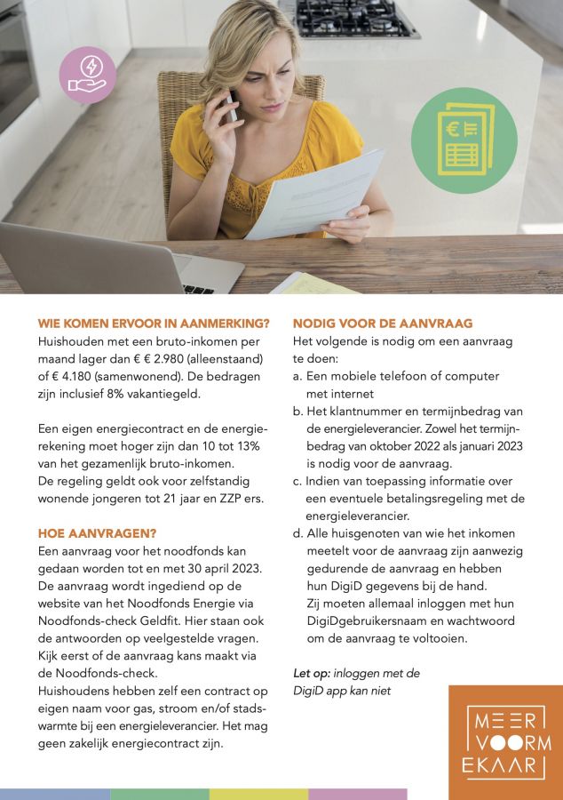 Huishoudens met een hoge energierekening kunnen t/m 30 april een aanvraag doen bij het Tijdelijk Noodfonds Energie. Het fonds betaalt deze winter een deel van de energierekening. Voor iedereen met een bruto inkomen tot €2.980 (alleenstaand) of €4.180 (samenwonend). Deze bedragen zijn inclusief 8% vakantiegeld.