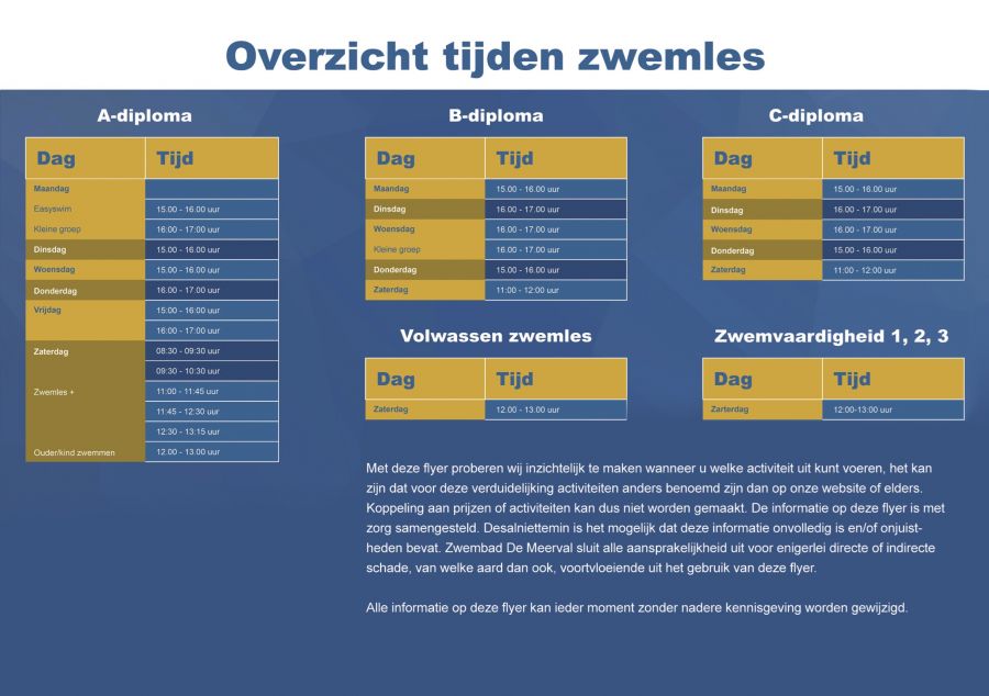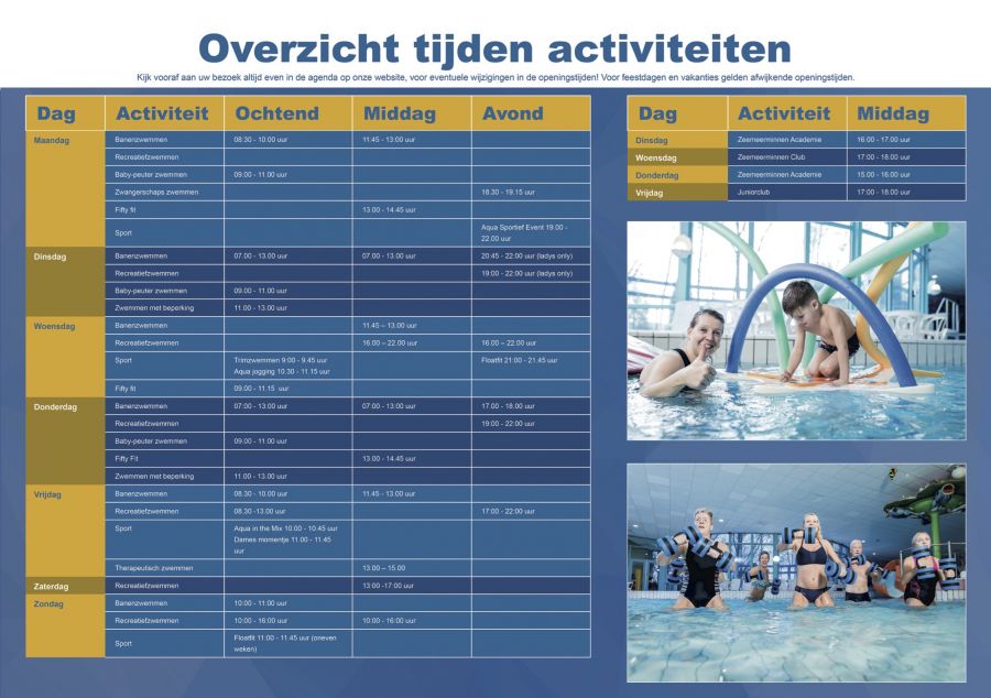 Om u de gelegenheid te geven om nu alvast uw ideale zwemmoment te plannen hebben we het nieuwe activiteitenrooster, per 28 augustus 2023, als bijlage toegevoegd. Wij begrijpen heel goed dat de impact van het nieuwe rooster voor iedereen anders is, wij zijn dan ook altijd bereid om samen met u te kijken naar de voor u best passende zwemmogelijkheid. Het nieuwe rooster heeft geen invloed op de geldigheid van de zwemkaarten, dat blijft allemaal zoals het is.