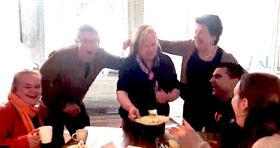 De taart nam Leonie maandag mee naar kantoor (kijk maar naar dit filmpje), want dit moest natuurlijk gevierd worden. Yvonne, koffiedrinkster van het eerste uur, had deze verrassing geregeld en natuurlijk kwam zij langs om een stukje taart te eten samen met medewerkers van MeerVoormekaar.