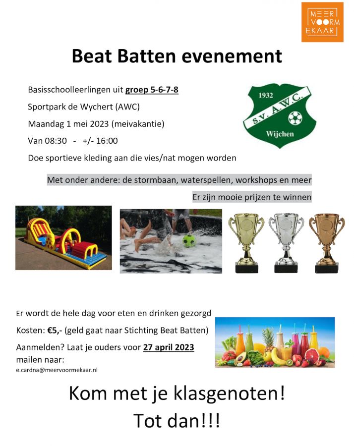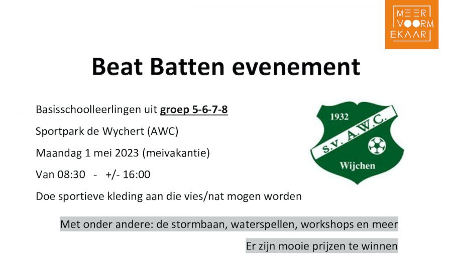 In de meivakantie organiseert het Jongerenwerk samen met een actieve jongere uit Wijchen een leuke speeldag voor de jeugd, met als subdoel geld op te halen voor het goede doel: Beat Batten.