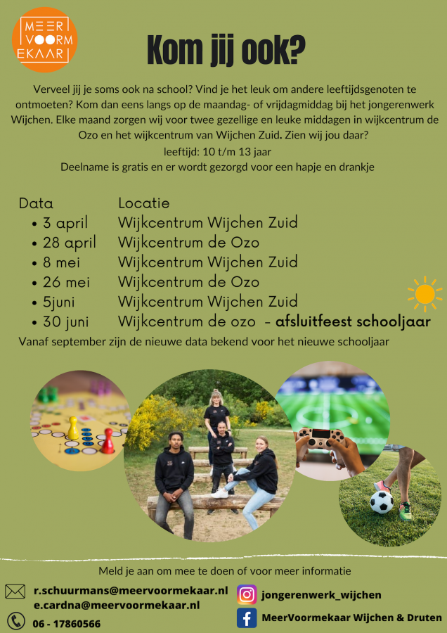 Verveel jij je soms ook na school? Elke maand verzorgt het Jongerenwerk van MeerVoormekaar Wijchen twee gezellige middagen in Wijkcentrum Zuid of in Wijkcentrum OZO (Urnenveldweg 10). Het is van 14.30 tot 16.00 uur. Leeftijd 10 t/m 13 jaar. Deelname is gratis.