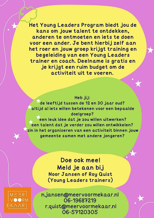 Het Young Leaders Program biedt jou de kans om jouw talent te ontdekken, anderen te ontmoeten en iets te doen voor een ander. Je bent hierbij zelf aan het roer en jouw groep krijgt training en begeleiding van een Young Leaders trainer en coach. Deelname is gratis en je krijgt een ruim budget om de activiteit uit te voeren.