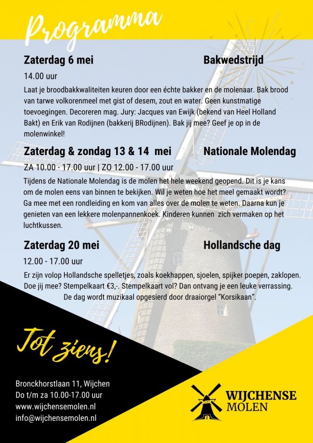 Broodbakkers kunnen meedoen met de bakwedstrijd en hun brood laten keuren door Jacques van Ewijk (bekend van Heel Holland Bakt) en Erik van Rodijnen (bakkerij BRodijnen). De Nationale Molendag staat voor de deur en er staat een heuse Hollandsche dag gepland!