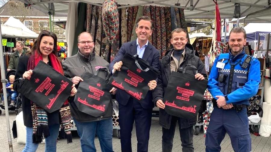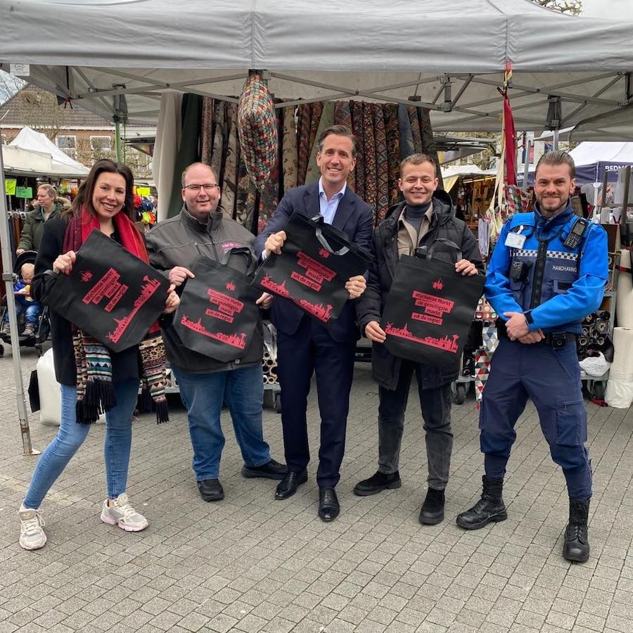 Centrummanager Rosanne Pak, marktmeester Patrick van den Berg, wethouder Nick Derks, marktverkoper & commissielid Roel Buikema en boa Florens Janssen. (Foto via Facebook gemeente Wijchen).