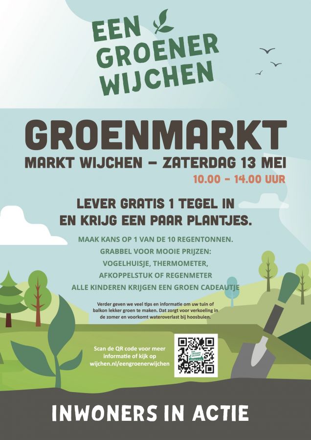 De gemeente staat op zaterdag 13 mei van 10.00 tot 14.00 uur met verschillende kramen op de Markt in Wijchen. Naast plantjes, is er ook een grabbelton met mooie prijzen. En bezoekers kunnen kans maken op een regenton. De gemeente en Natuur Wijchen geven tips en informatie. Voor alle kinderen is er een groen cadeautje.