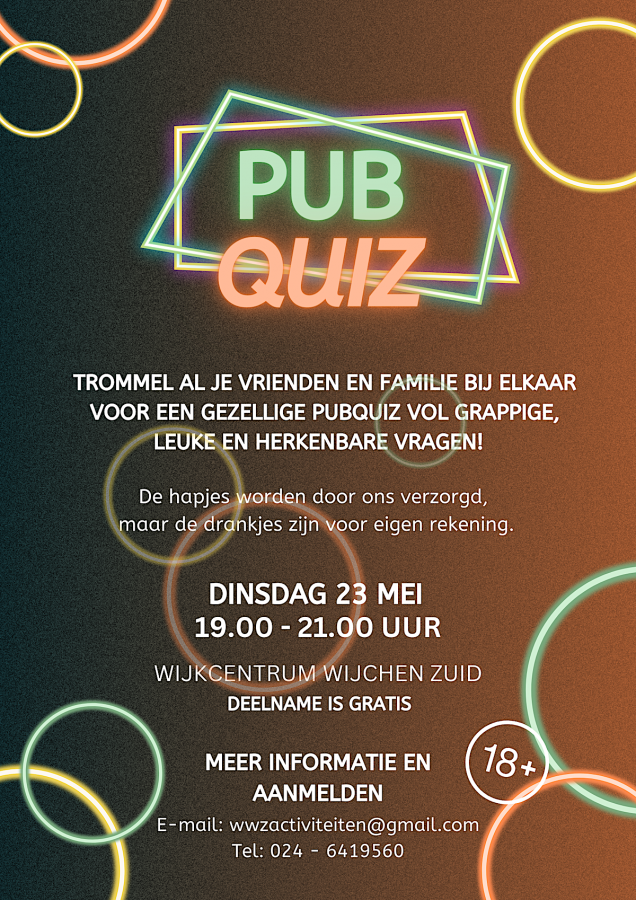 Voor het eerst in de geschiedenis wordt er in Wijkcentrum Wijchen Zuid een PUBQUIZ georganiseerd.