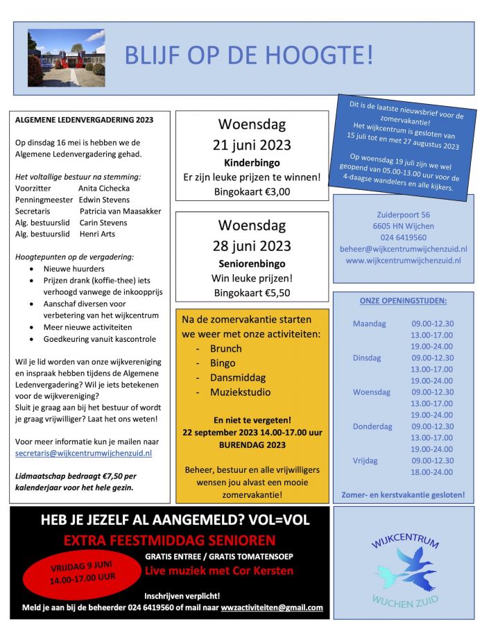 Alvast noteren! Ook in de maand mei zijn er leuke activiteiten in Wijkcentrum Wijchen Zuid aan de Zuiderpoort 56. Kijk maar op de poster! Meer info: 024 6419560 www.wijkcentrumwijchenzuid.nl beheer@wijkcentrumwijchenzuid.nl