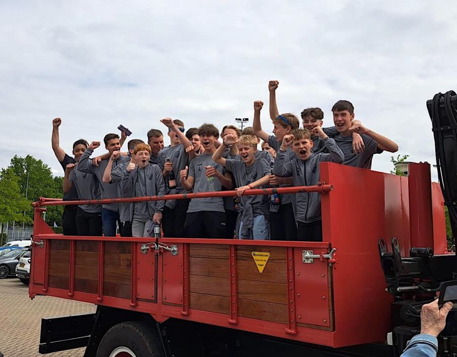 De JO14-1 geeft het stokje graag door aan de JO15-1 die a.s. zaterdag 27 mei in Bemmel ook nog voor het kampioenschap in de Hoofdklasse gaat strijden.