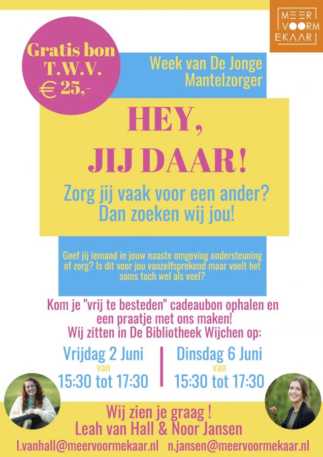 Op vrijdag 2 juni en dinsdag 6 juni tussen 15.30 en 17.30 uur delen Leah en Noor, twee medewerkers van MeerVoormekaar, vrij te besteden cadeaubonnen t.w.v. 25 euro uit in De Bibliotheek Wijchen. Zij zitten hier voor de jonge mantelzorgers klaar om een praatje te maken en de verdiende cadeaubon uit te delen.