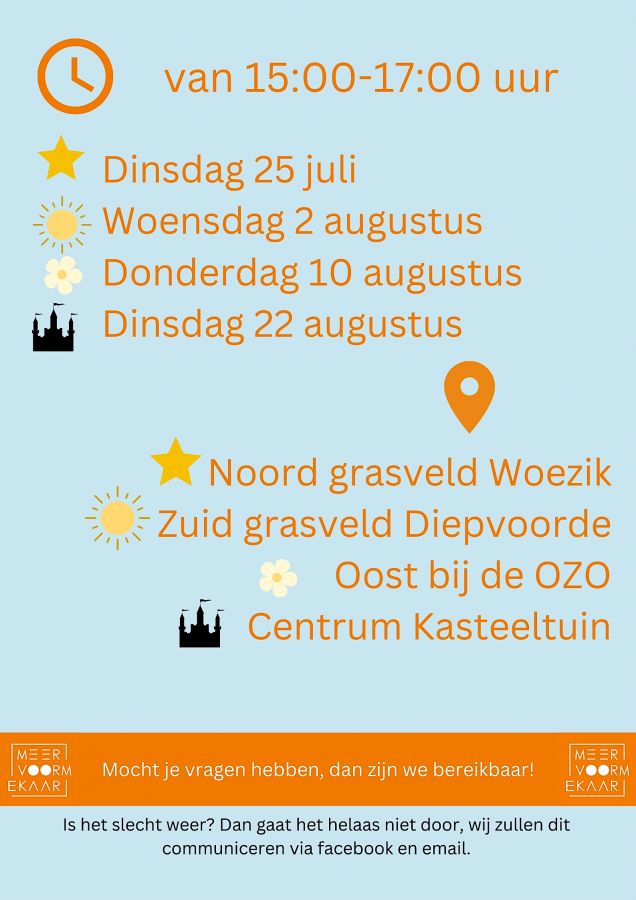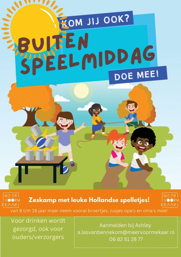 Op 4 dagen in de zomervakantie organiseert welzijnsorganisatie MeerVoormekaar Buitenspeelmiddagen. Klik op de flyer voor alle bijzonderheden en aanmelden. Veel plezier!